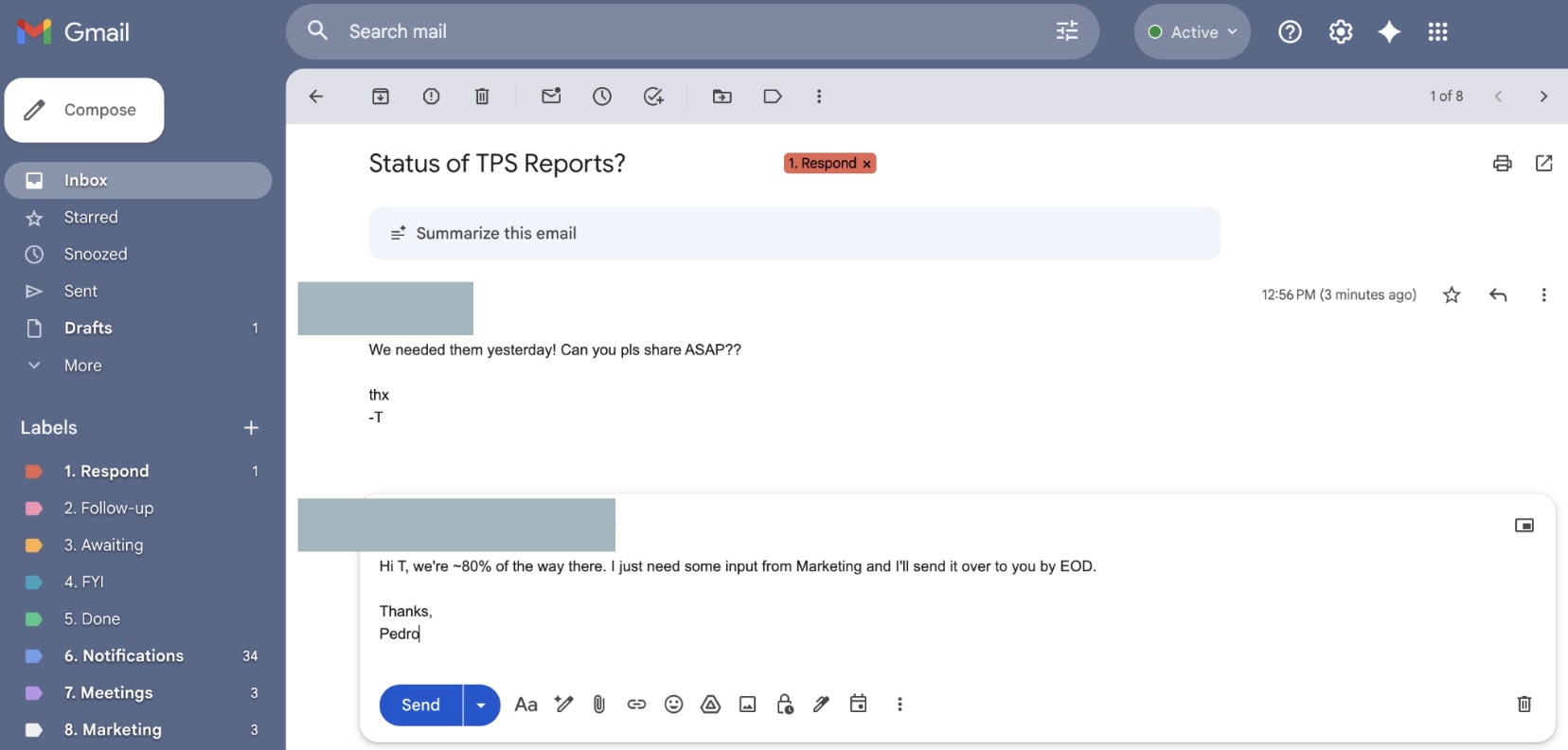Review and send instead of staring at a blank compose window. Drafts match your voice and tone.